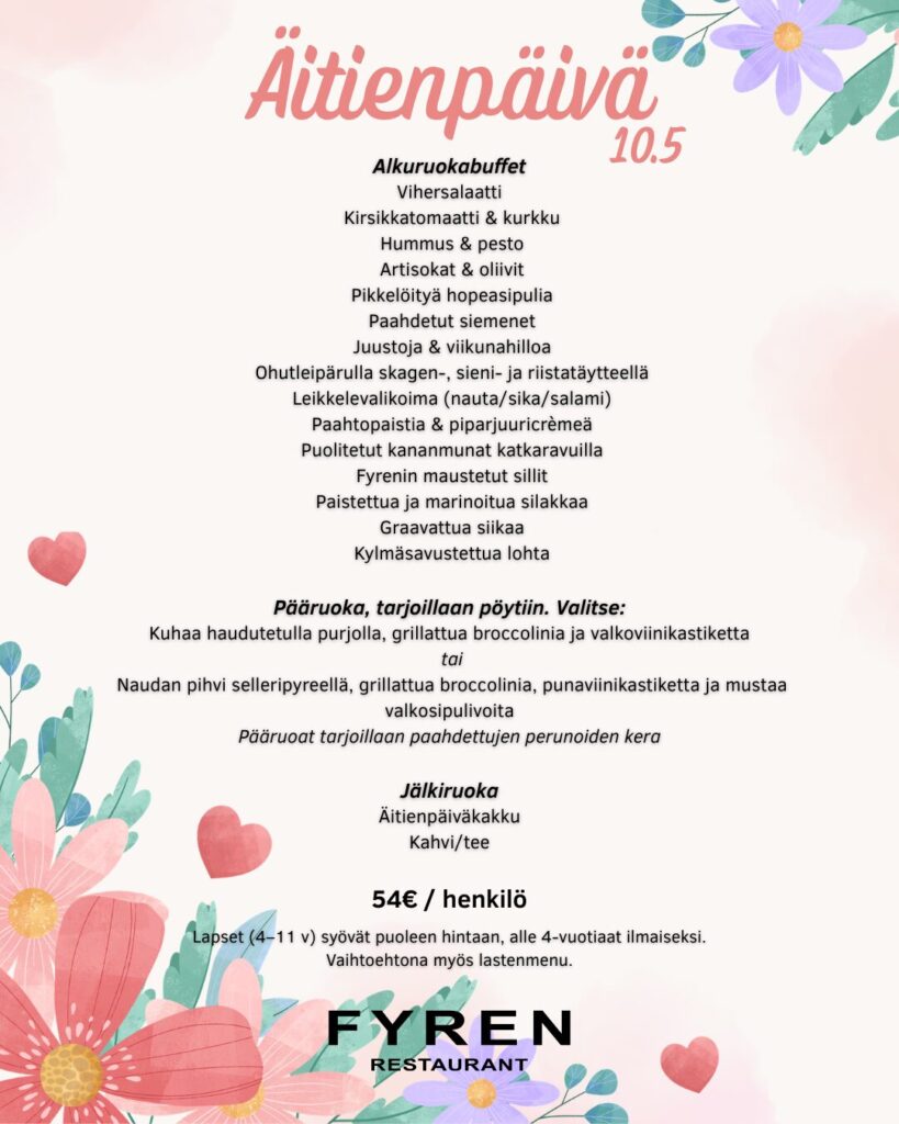 Tarjoamme runsaan alkuruokabuffetin, pääruoan pöytiin tarjoiltuna (valittavana kuha tai naudanpihvi) sekä kahvin ja herkullisen äitienpäiväkakun. 🍰✨